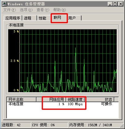 B: 以网通服务器测试, 选择网通服务器, 下载一个大文件. 在下载时.然后在"开始"->"运行", 输入 "taskmgr",出现 window任务管理器 查看 带宽消耗状况.